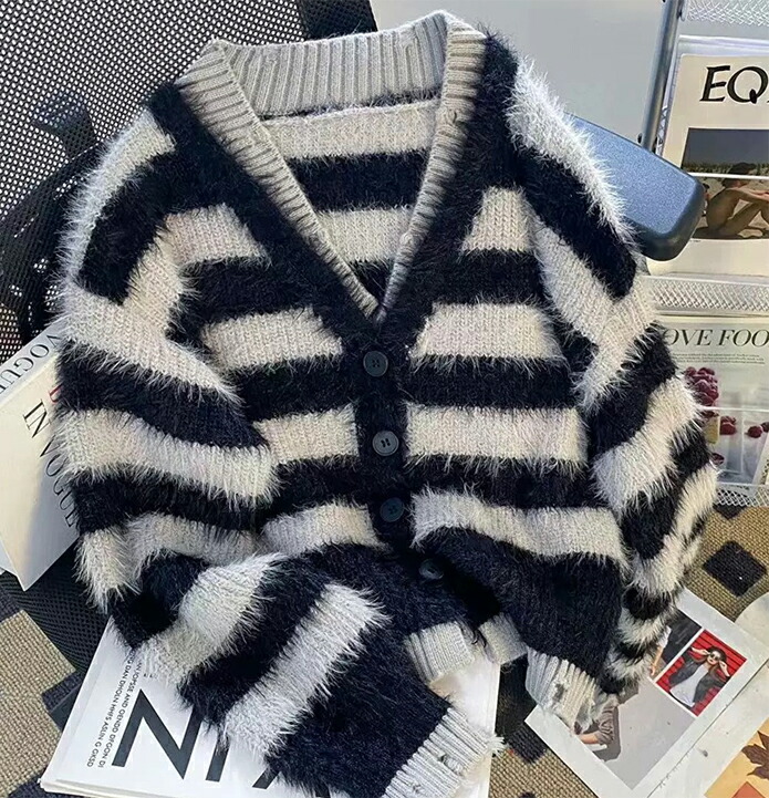 3B10 シャギーニット ボーダー柄カーディガン ショート丈 トップス 長袖 シャギー ニット レディース vネック シャギーニットカーディガン きれいめ ファー ニットセーター 秋冬 春 秋 可愛い