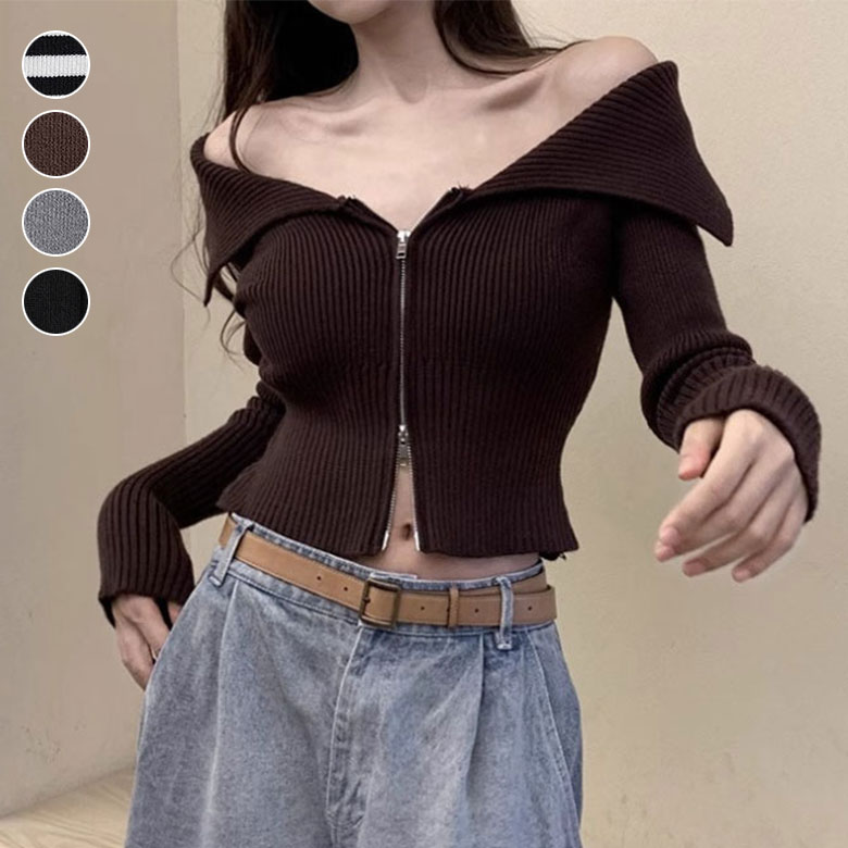 ラペル ニット カーディガン レディース 春 秋 きれいめ シンプル スリム 長袖 カーデ ニットカーディガン ダブルジッパー ショート丈 お洒落 カジュアル 韓国ファッション セーターカーディガン