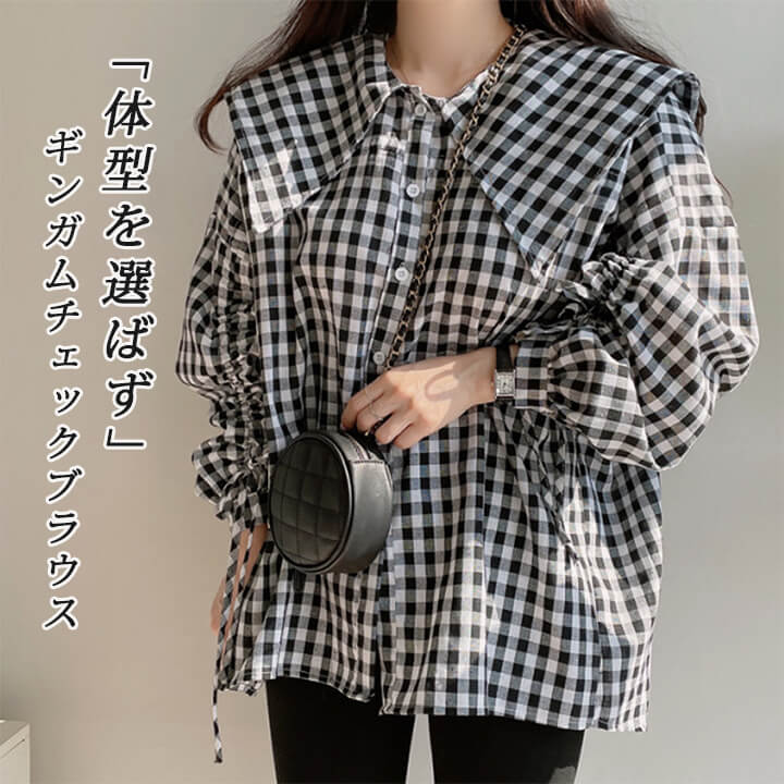 2A46ギンガムチェックブラウス レディース ゆったりシャツ ボリューム袖 二の腕カバー 体型カバー バーゲン 可愛い