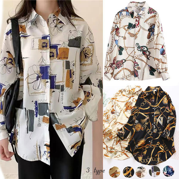 2A4 総柄シャツ レディース 長袖 プリント 柄 薄手 襟付き カジュアルシャツ ゆったり ビッグシャツ ファッション トレロ トップス長袖シャツ プリントシャツ 開襟シャツ ブラウス