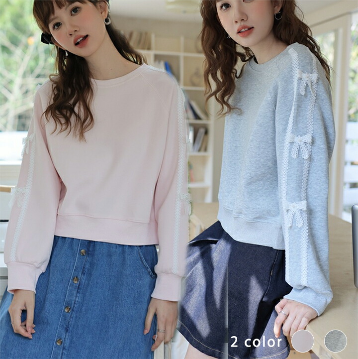 袖レースライン&リボンスウェット トレーナー レディースサイドレースラインリボントップス 2カラー 春 秋トップス ショット オフショル トップス 長袖 スウェット ゆったり カジュア ラウンドネック