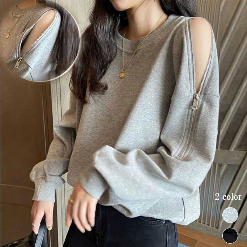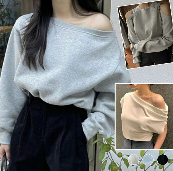 オフショルダーデザインスウェット オフショルダー スウェット トップス ラウンドネック スウェットシャツ