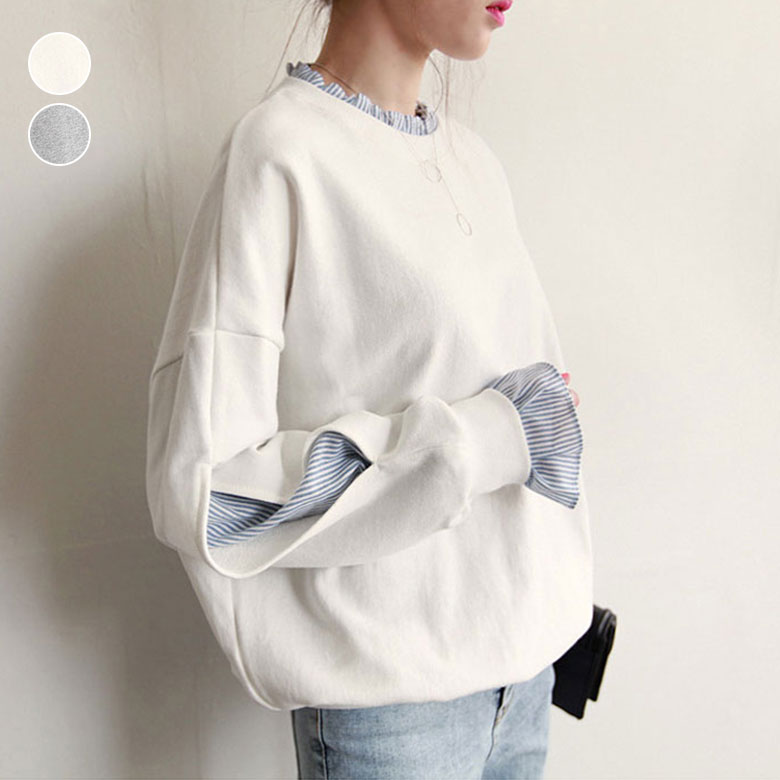 2A19 フェイクレイヤードスエードクルーネックスウェット ボーダーフェイクレイヤード レーナー パーカー レディース プルオーバー ゆったり 韓国 トップス 長袖 無地 体型カバー お出か おしゃれ