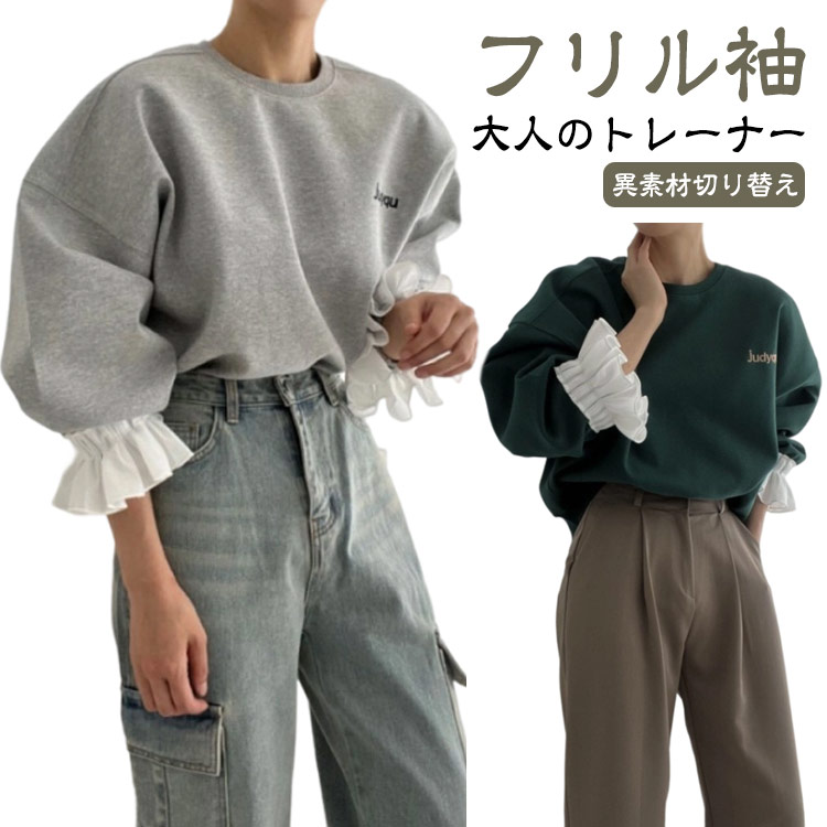 トレーナー レディース 秋 春 長袖 トップス 重ね着 トレーナー 異素材切り替え フリル袖 無地 シンプル ゆったり カジュアル ボリューム袖 大きいサイズ ゆるっと 着瘦せ お洒落