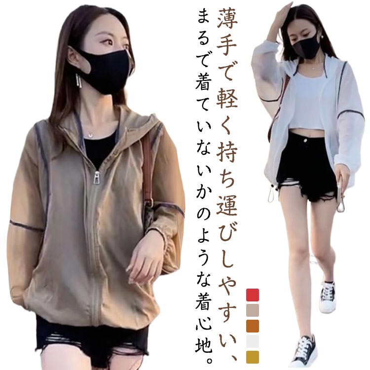 ジップアップ 帽子 パーカー フード 付き 全6色 パーカー 対策 アウター サマーパーカー 透け感 前開き シアー 紫外線対策 春夏 秋