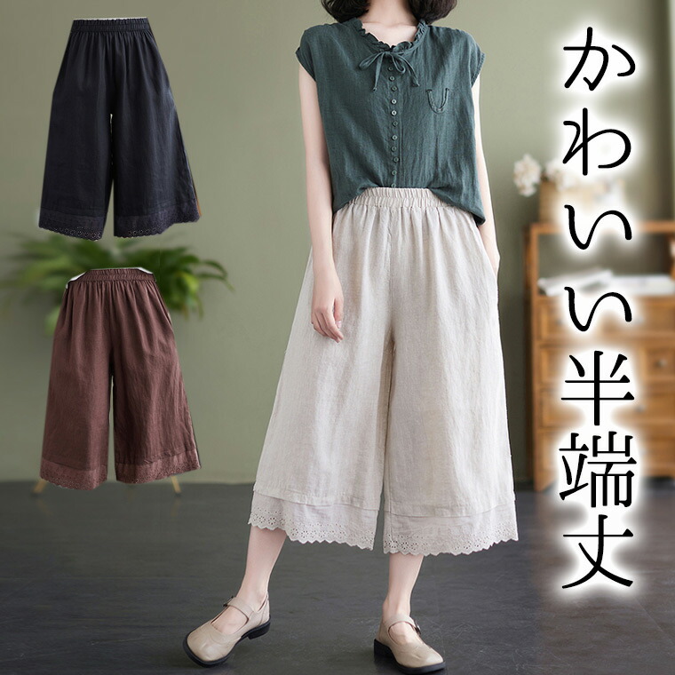 -2まで おとな可愛い半端丈 上品シルエット 40代 50代 レース さらりと履ける 重ね着 レイヤード ワンピースと合う リネンパンツ リネン 麻 インナー ペチパンツ ロング ペチコート レ