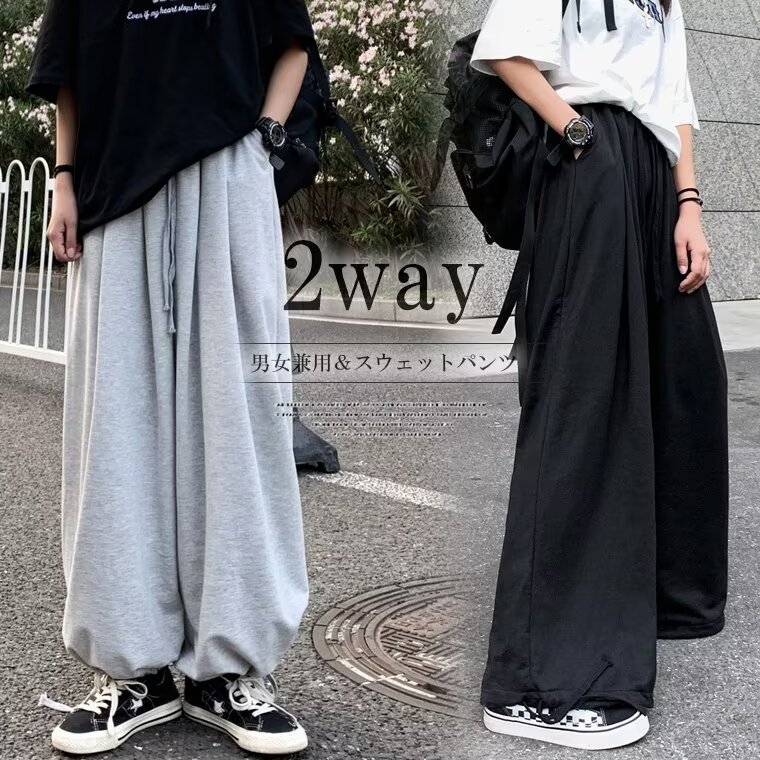裾の絞り具合によって雰囲気を変える 全2色 2way ボトムス ズボン カジュアルパンツ ルーズワイド スウェットパンツ ワイド レッグ スポーツ 裾絞れる仕様 ヒップホップ ダンス衣装 ストリート系