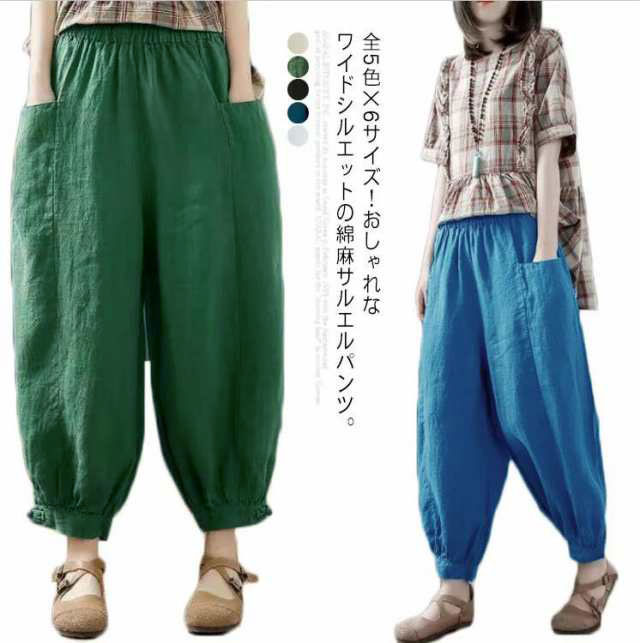 サルエルパンツ アンクル丈 綿麻 パンツ サルエル ワイドシルエット レディース ボトムス 体型カバー