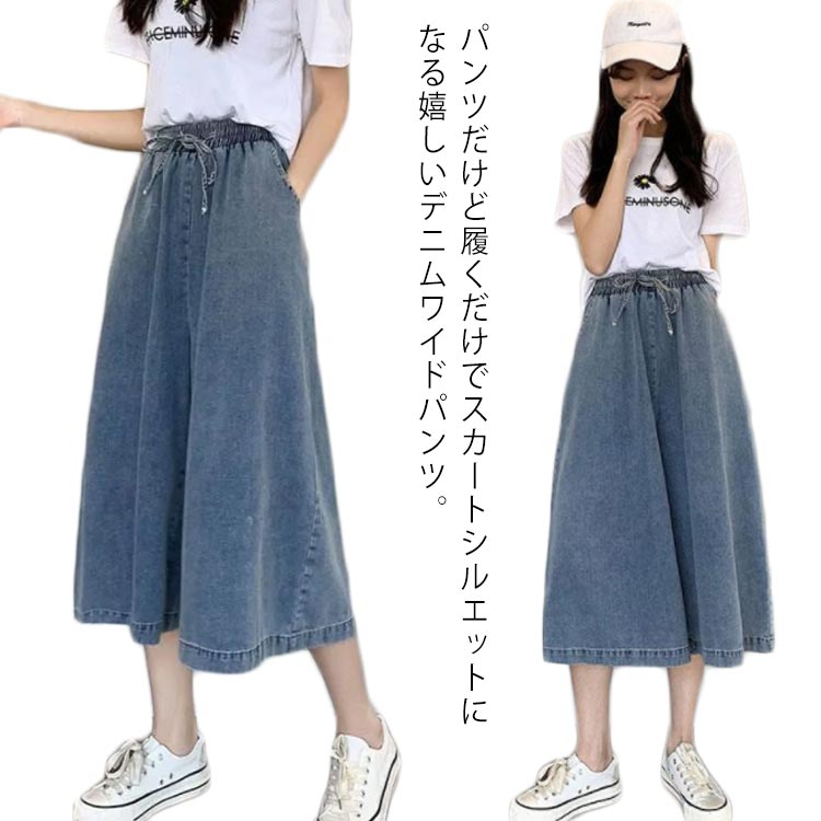 レディース デニムワイドパンツ デニムパンツ 七分丈 ハイウエスト ガウチョパンツ 無地 ワイドパンツ