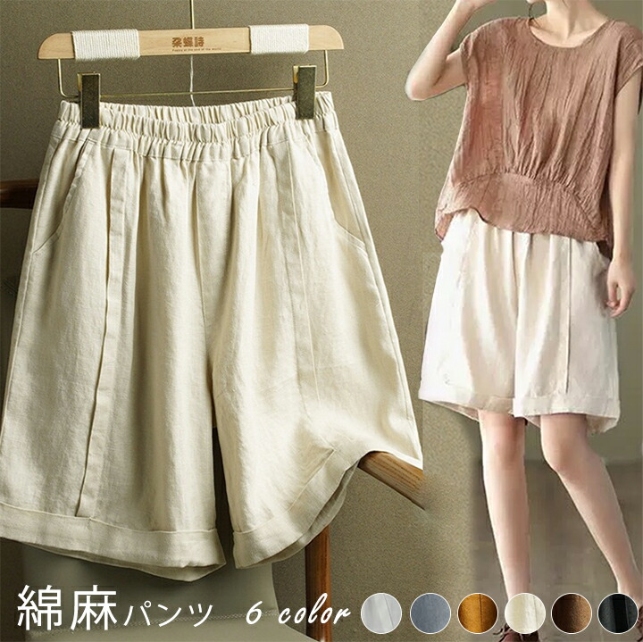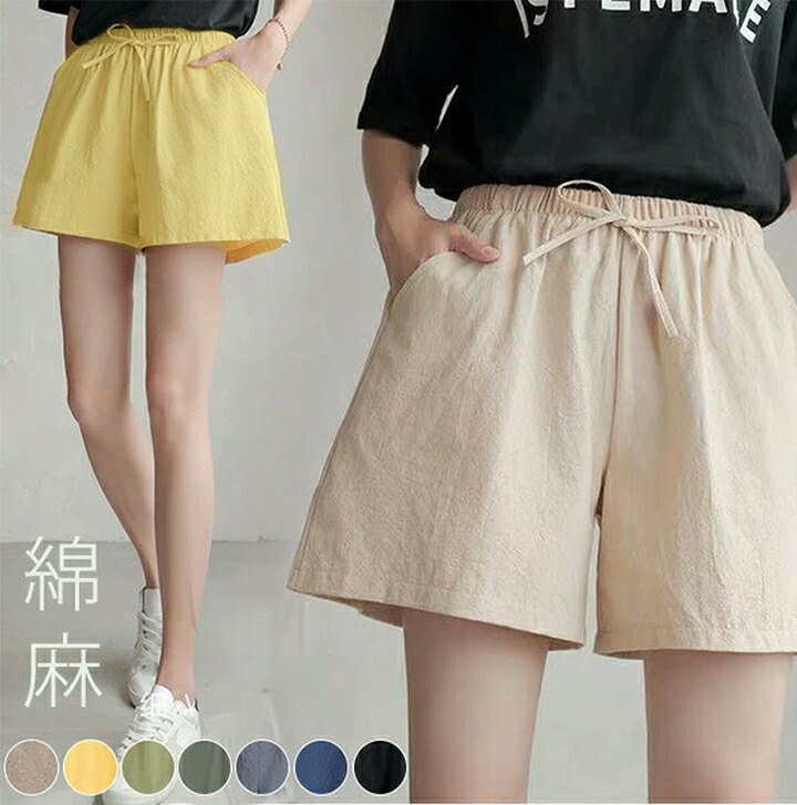 綿麻 ショートパンツ 短パン 無地 ハイウエスト ウエストゴム ゆったり レディース 大人 春夏 トレンド 快適通気