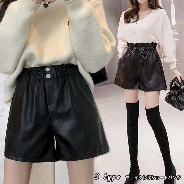 ☆3タイプ ショートパンツ レディース レザー パンツ ライン ゴム ハイウエスト 光沢 柔らか ショーパン