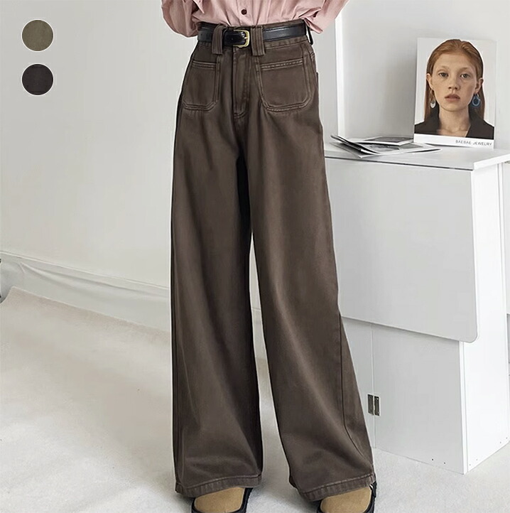 コットン100% デニムハイウエスト ワイドパンツ ジーンズ デニムパンツ ワイドデニム ストリート カーキ ダークブラウン