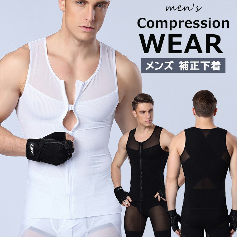 メンズ 補正下着 ぽっこりお腹を引き締めてくれる ノースリーブ タンクトップ 加圧インナー 前開きジッパータイプ 2色