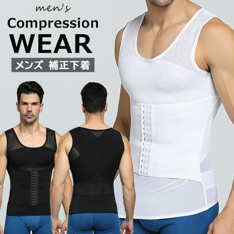 メンズ 補正下着 ぽっこりお腹を引き締めてくれる ノースリーブ タンクトップ 加圧インナー フロント3段フック 2色