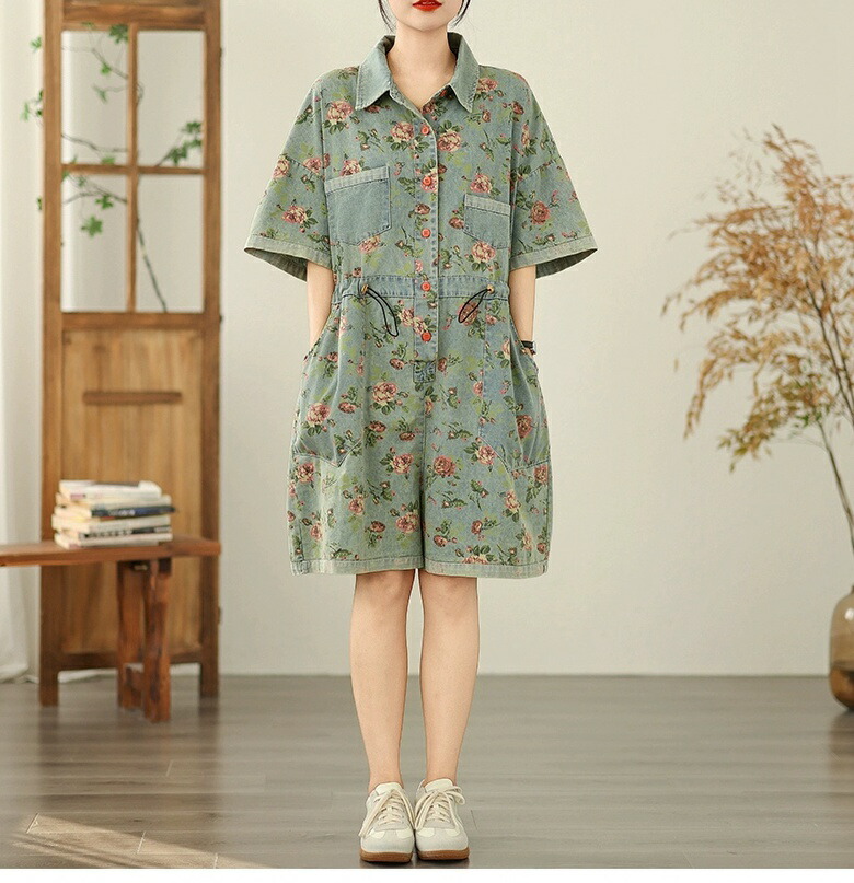 オーバーオール デニム 夏春 大人可愛い サロペット ジャンプスーツ 花柄 半袖 体型カバー 大きいサイズ レディース チュニック ワンピース パンツ ロンパース 作業服 ジャンパース オールインワン