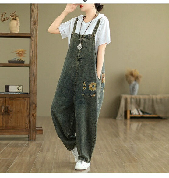 デニム オーバーオール 刺繍 サロペット ボトムス オールインワン ロング パンツ 夏 春 秋 大きいサイズ レディース ロンパース 作業服 つなぎ キャミ カジュアル サルエルパン ジャンパースカー