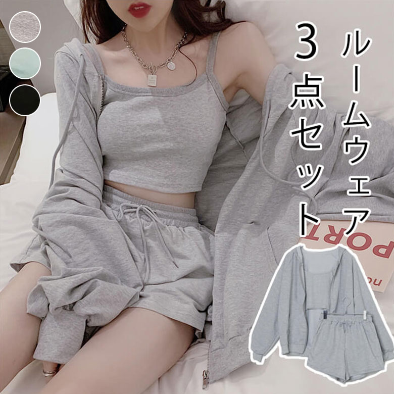 2A13 3点セットルームウェア レディース セットアップ 上下セット BIGシルエットパーカー&キャミソール&ショートパンツ パジャマ 可愛い お洒落 シンプル クロップド丈 スウェット ポケ 無地