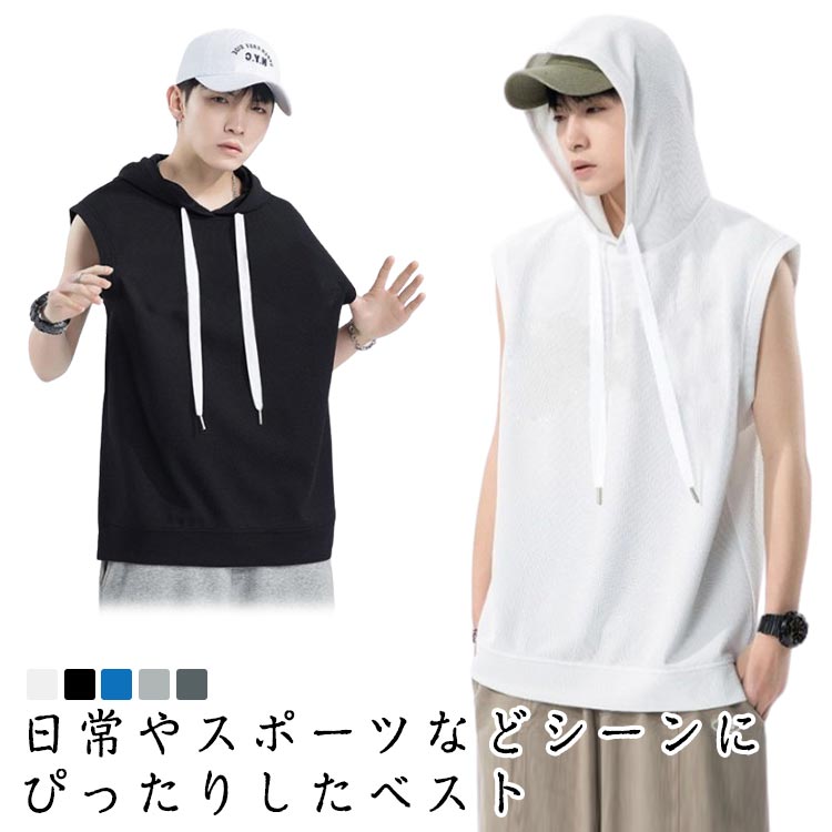 メンズ タンクトップ フード付きベスト 袖なし プルオーバー パーカーベスト 重ね着 薄手 カジュアル 夏 ゆったり ノースリーブ トップス パーカー 無地 ベスト スウエット