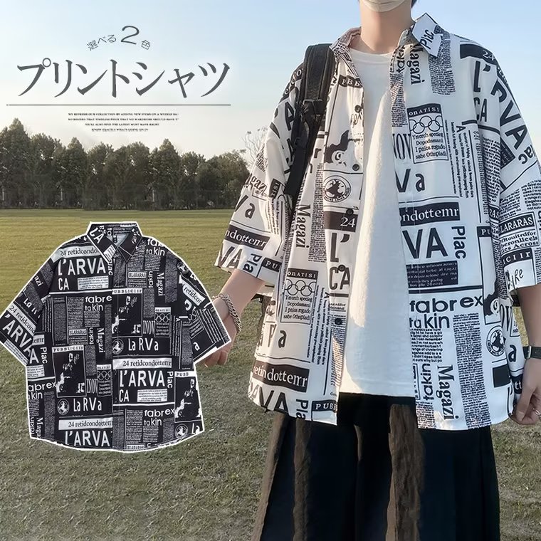コーデをさらにオシャレにしてくれる メンズ 古着風シャツ カジュアルシャツ 薄手 ワイシャツ 新聞風柄 英字 デザイン 原宿 ストリート 半袖 シャツ 春 夏 秋