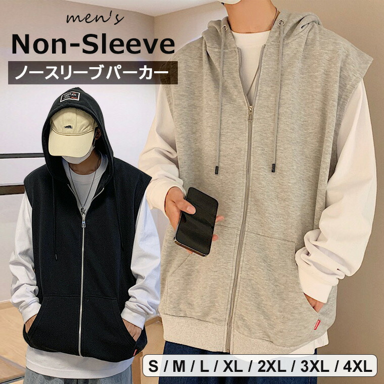 ゆったりシルエットのノースリーブパーカー メンズ ノースリーブパーカー トップス フード付き ノースリーブ パーカー 男性 ゆったり かっこいい 無地 ビッグシルエット レイヤード カジュアル 全2