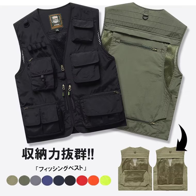 背中部分を収納すると夏用の網ベストに変身 フィッシングベスト メッシュ 通気性 カメラマンベスト ミリタリー メンズ レディース 多機能 ジャケット アウトドア アウトドアベスト 登山 お釣り 作業服