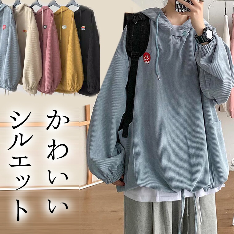 かわいい系男子に 裾しぼってコロンとしたシルエット コーデュロイパーカー ゆったりオーバーサイズ 韓国ファッションフリース パーカー 長袖 プルオーバー ニット メンズ レディース コクーンシルエット