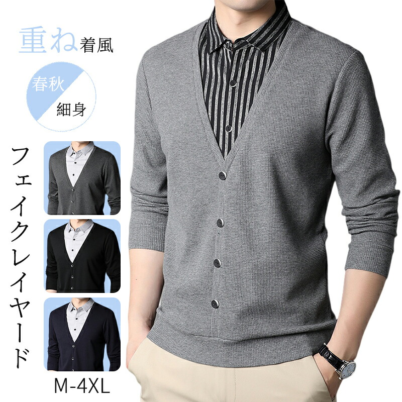フェイクレイヤード シャツ メンズ 長袖 Vネック 春秋 シャツセーター 重ね着 ビジネス ゴルフウエア プルオーバー カーディガン フォーマル 紳士服 ワイシャツ 洗える 無地 セーター カジュアル