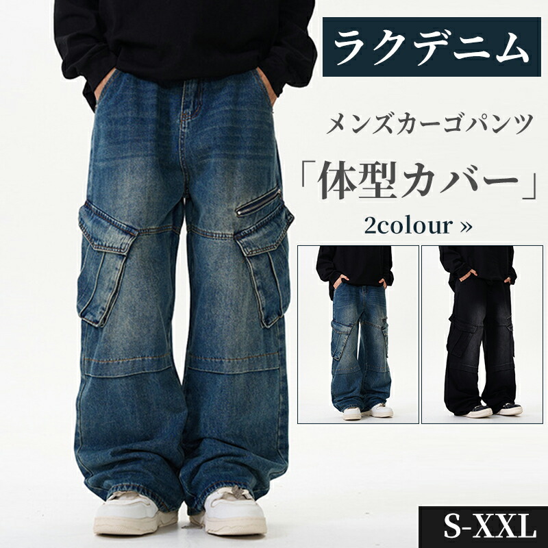 デニム メンズ パンツ カーゴパンツ 大きいサイズ ゆったり 体型カバー ミリタリー 太め ジーンズ ストリート系 インディゴ イージーパンツ 青少年 おしゃれ ポケット付き テーパードパンツ スポー