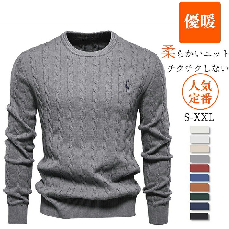 【送料無料】ニットセーター ストリート あったか ケーブルニット 丸首 ゆったり 無地 コットン ウォッシャブル 紳士服 オフィス 全10色 2