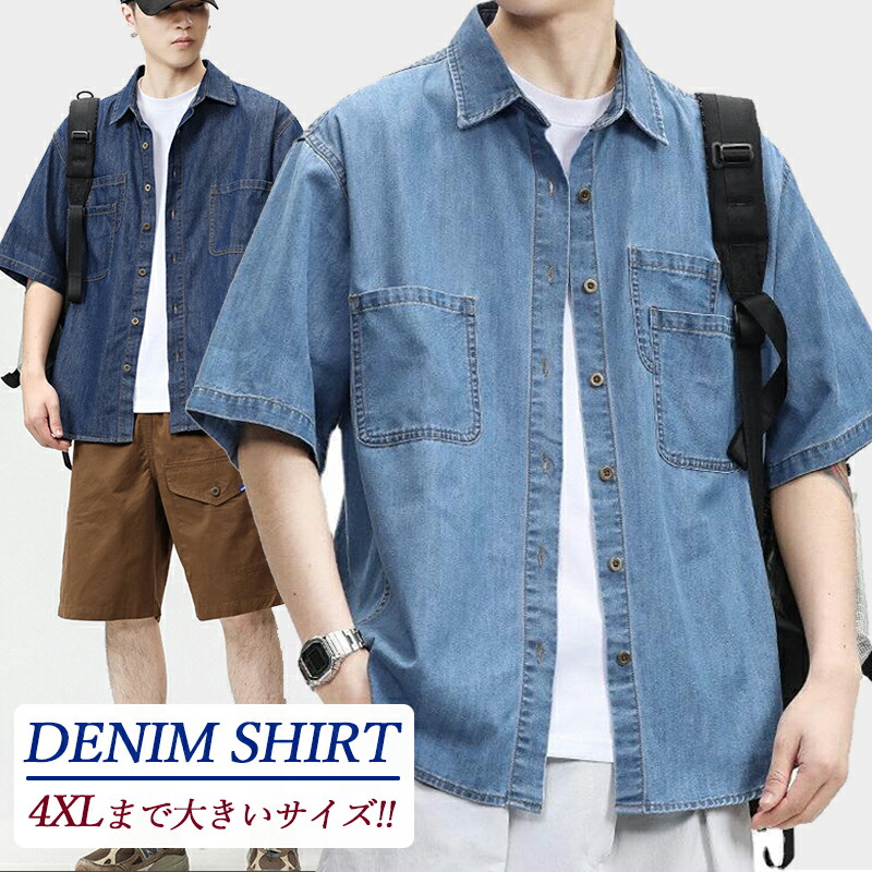 【送料無料】 メンズ シャツ 半袖 デニム ワークシャツ 半袖シャツ かっこいい シンプル ジャケット 開襟シャツ プレゼント ビッグシルエット ブルー ネイビー 定番 ~4