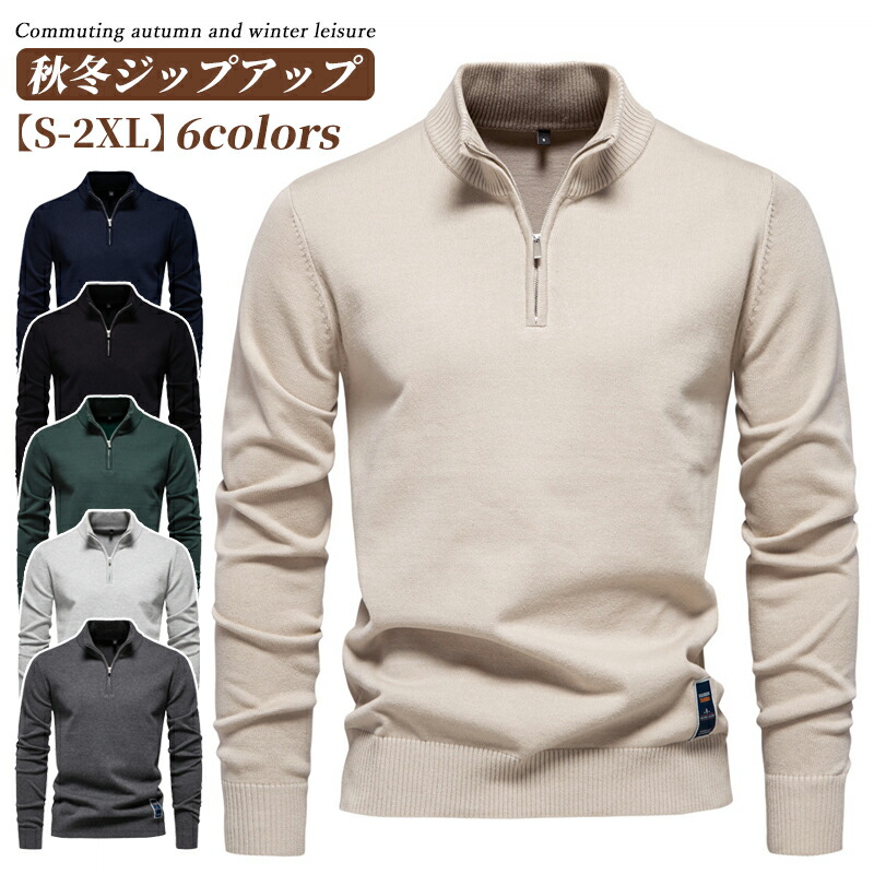 【送料無料】ニットセーター メンズ モックネック 無地 ジップニット オフィス シンプル 定番 30代 40代 50代 60代 ゴルフ 立ち襟 モックネックシャツ 保温 防寒 5色 2