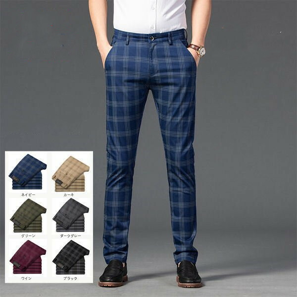 スリムパンツ ビジネススラックス メンズ カジュアル ストレッチパンツ 紳士 チェックパンツ 通勤用 スラックス 家庭洗濯可 春夏秋