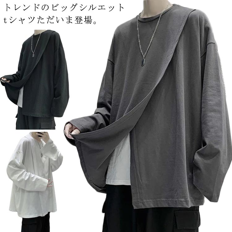 メンズ 長袖 シャツ 大きいサイズ 無地 ゆったり ビッグT カットソー アシンメトリー クールネック