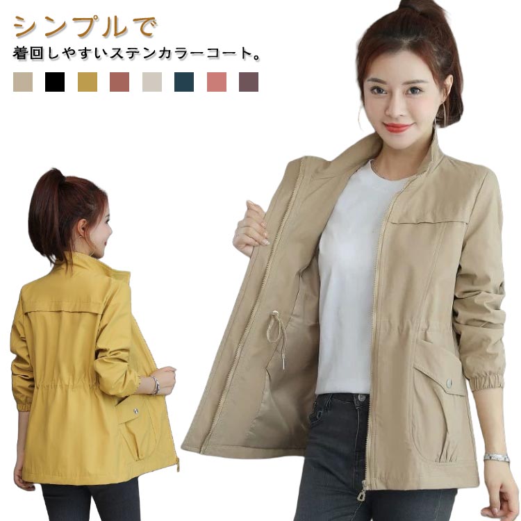 スプリングコート レディース 新作 ジャケット 裏地付き 立ち襟 コート 長袖 無地 アウター トップス ウエストマーク 紐 ファスナー 前開き カジュアル 大人