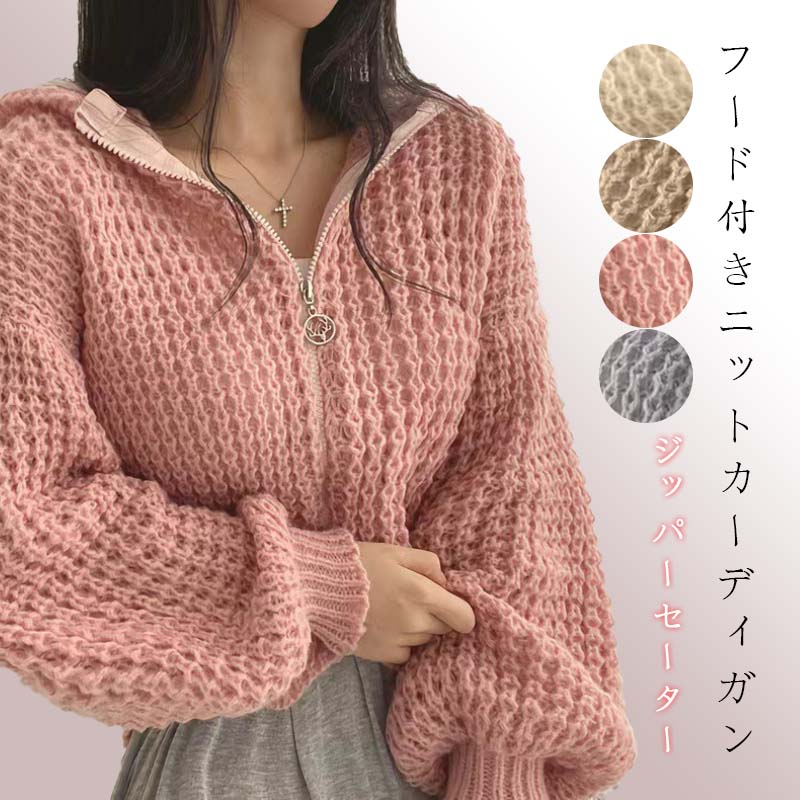ワッフル編みニットパーカー トップス カーディガン ワッフル パーカー レディース ニット 長袖 春秋冬 セーター 無地 ショット丈セーターアウター ゆったり ジッパー暖かいフード付きコート ダークエ