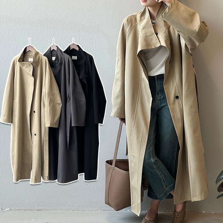 トレンチコート レディース 秋 秋服 ロング丈 ロングコート 綿 コットン ゆったり 立ち襟 無地 シンプル カジュアル