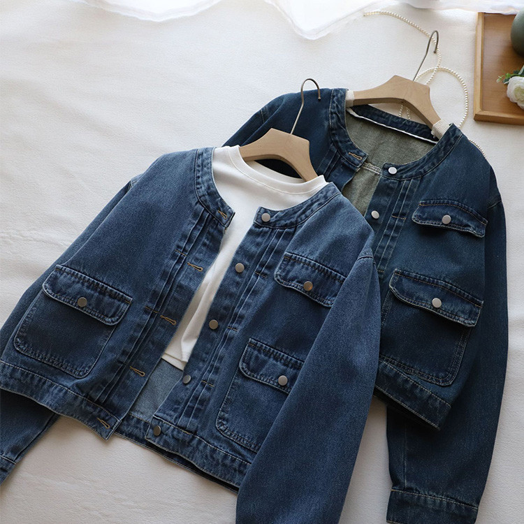 ショート丈 ブルゾン デニムジャケット レディース ノーカラー アウター コート デニムコート ジャケット トップス 長袖 春 春服 おしゃれ ショート丈 クルーネック コーデ