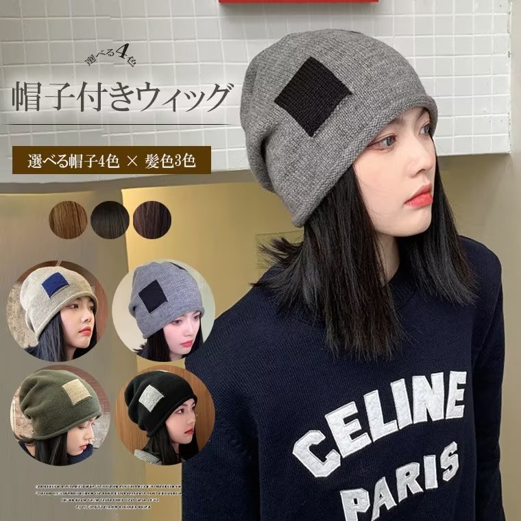 ウィッグと帽子を合わせてかぶれる レディース用ウィッグ付きニットキャップ 髪付き帽子 ニットキャップ かつら付きキャップ ウィッグ付き帽子 ウィッグ セミロング ストレート ウィッグ一体 帽子5色×髪