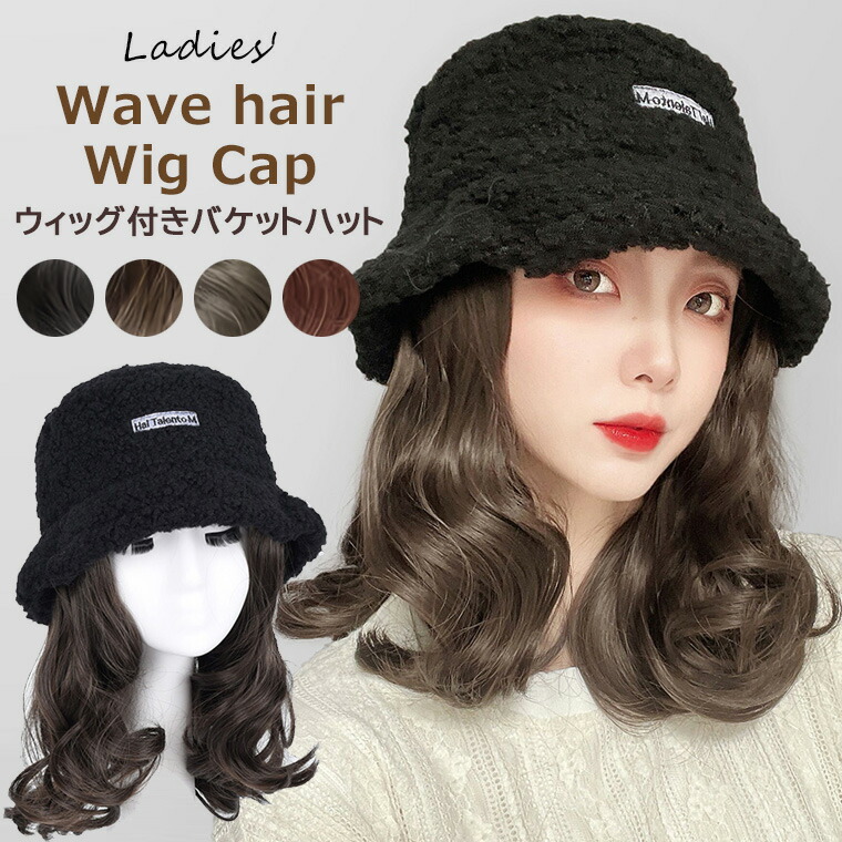 ウィッグと帽子を合わせてかぶれるウィッグ付き帽子♪ 髪付き帽子 バケットハット かつら付きバケットハット ウィッグ付き帽子 ウィッグ セミロングヘア セミロング ウェーブ ウィッグ一体 全4色