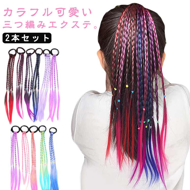 ウィッグ ゴム付き カラフル 髪留め ポニーテール 2本セット 子供 キッズ 編み込み 三つ編み エクステンション ヘアゴム グラデーション ヘアアクセサリー ダンス 発表会 学園祭 メッシュ