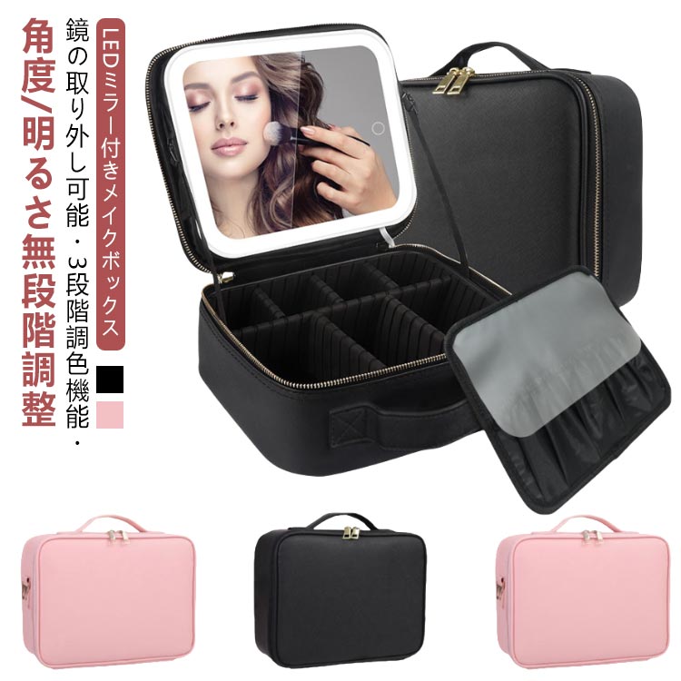 仕切り メイクボックス ライト付き LED 3色調光 化粧品 鏡付き 充電式 取り外し可能 化粧ボックス コスメ LEDミラー付き 化粧箱 化粧品入れ 防水 ケース メイク 収納 小物入れ ジ 大容量