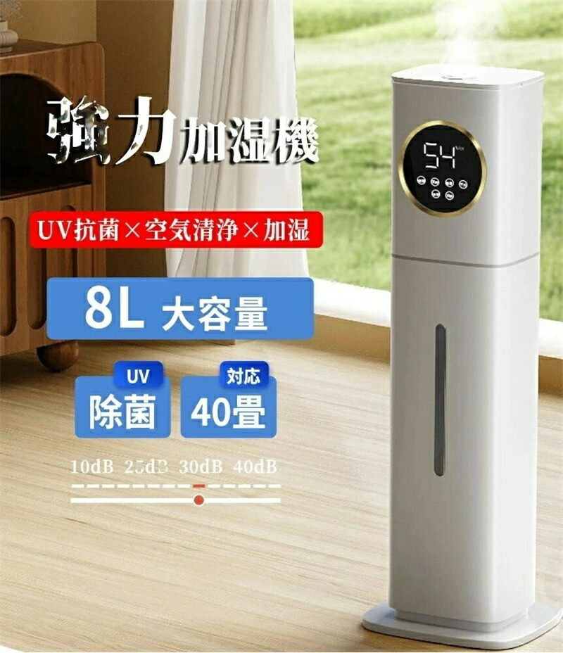 加湿器 超音波式 大容量 8L 空気清浄機 花粉対策 UVライト付き 除菌 自動湿度調節 空焚き防止 上部給水 最大噴霧量300ML H 40畳 静音 節電 省エネ 吹出し口360°回転