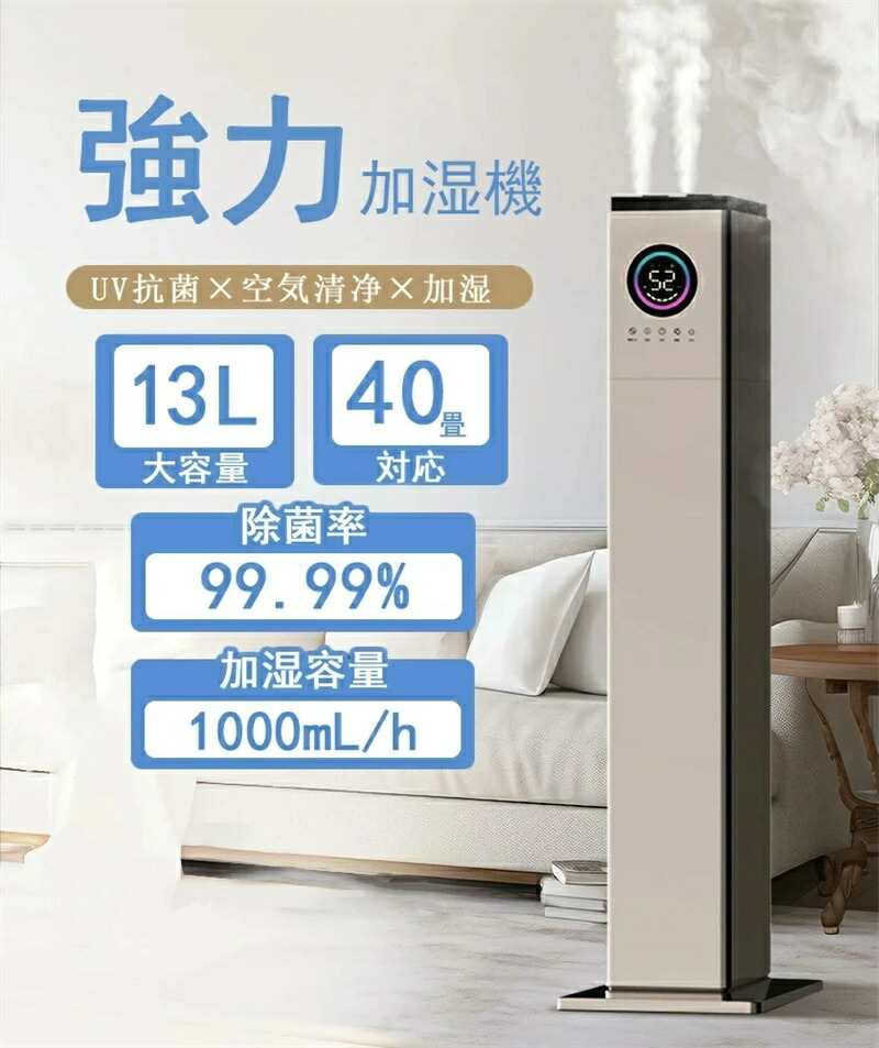大容量13L ダブルノズル 吹出し口360°回転 空気清浄機 花粉対策 UVライト付き 除菌 自動湿度調節 空焚き防止 上部給水 6段階調節 最大噴霧量1000ML H 40畳 静音 節電 省エネ