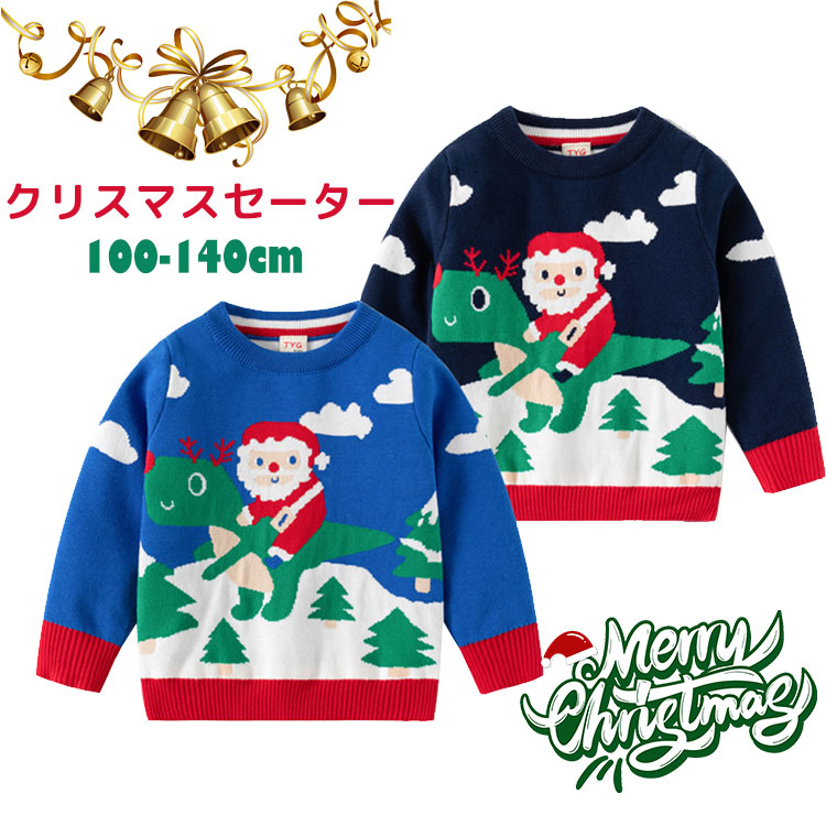 男の子 クリスマスセーター キッズ かわいい 恐竜 サンタさん サンタクロース 子供服 薄手 ニットセーター プルオーバー ブルー ネイビー 秋冬 トップス 幼稚園 小学生 クリスマスプレゼ