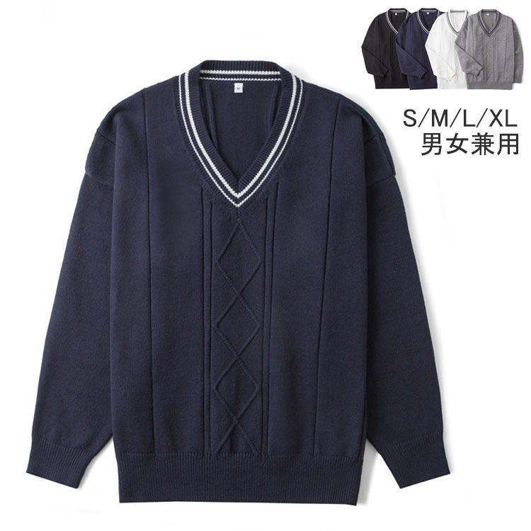 Vネック ニットセーター スクールセーター ライン入り 学生服 上着 アウター 女子高生 制服 長袖 スクールニット 学校制服 レディース 男女兼用 ユニセックス 4色 S M L XL ホワイト ブ