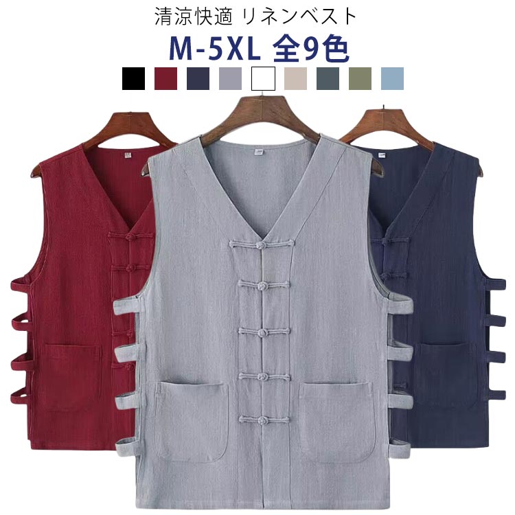 30代 麻 チョッキ ベスト 春夏 綿麻 ギフト ジレ 綿 20代 薄い コットン リネン 中華風 清涼 コットンリネン ネック 40代 50代 60代 高齢者 父の日 敬老の日 プレゼント メンズ