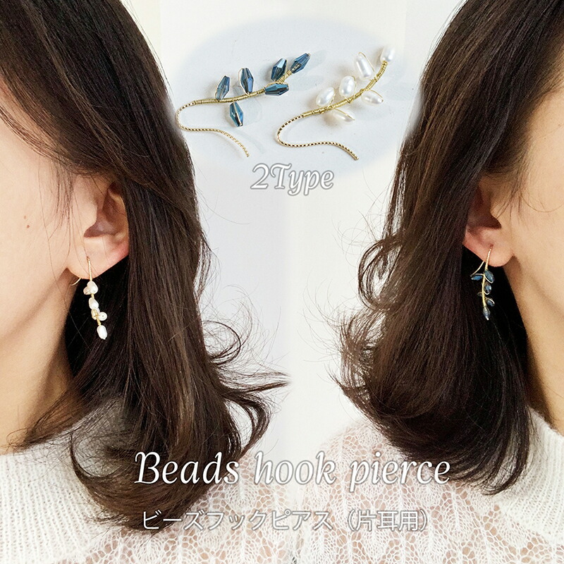 E-6 淡水パールフックピアス淡水パールビーズクリアビーズ2タイプ片耳用アシンメトリーゴールドアンティークレディースアクセサリー