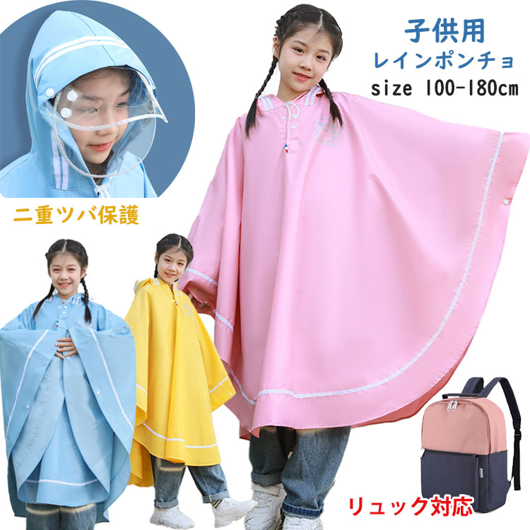 3色 レインポンチョ キッズ レインウェア レインコート 子供合羽 二重ツバ ランドセル対応 男の子 女の子 雨具 雨カッパ 軽量 通気速乾 薄型 レイングッズ 通学 自転車 キャンプ アウトドア L