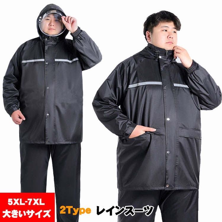 レインコート 2点セット レインウェア上下セット メンズ レインスーツ アウトドア 反射テープ付き 二重透明バイザー付き 防災 自転車 バイク 通学 通勤 豪雨 梅雨 ビッグサイズ 5XL 6XL 7