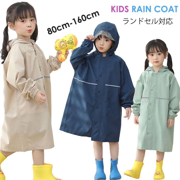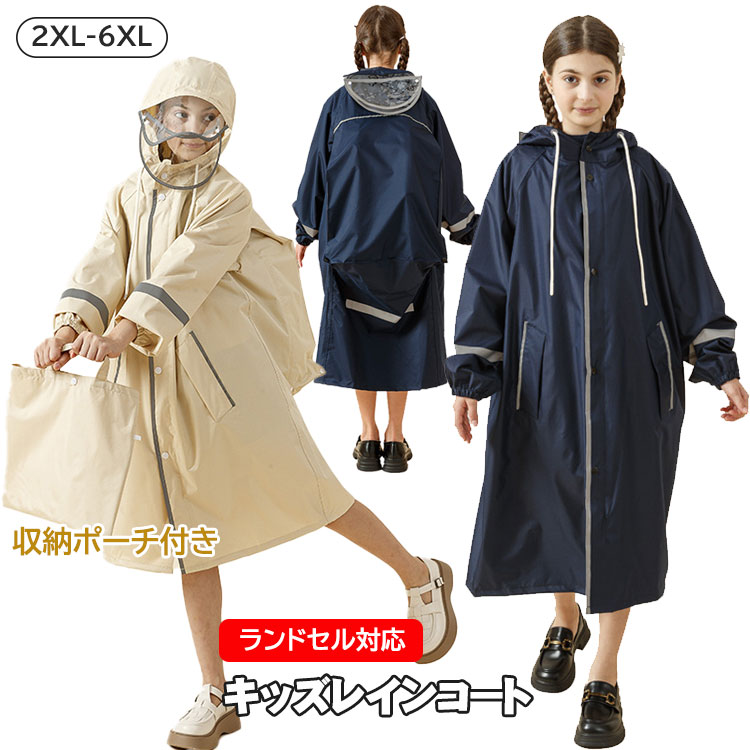 キッズ ジュニア はっ水 レインコート ランドセル対応 リュックサック対応 女の子 男の子 子供 カッパ レインウェア ポンチョ 雨具 通学 防災 防寒 防風 収納袋付き カーキ ネイビー 2XL-6
